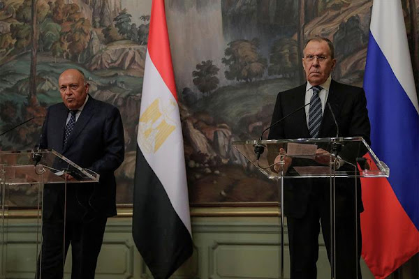 Russian Foreign Minister Sergei Lavrov (R) and his Egyptian counterpart Sameh Shoukry hold a joint press conference following their talks…