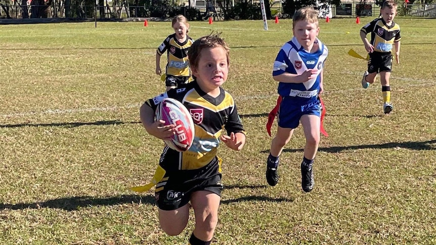 Six-year-old Caloundra Sharks player Parker Tennant currently has 89 tries for the 2023 season, with five games left to play.