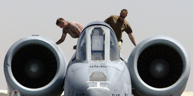 U.S. Air Force ground maintenance crewmen check over the engines of an A10 Thunderbolt “Warthog” after it had returned from a mission. (Ian Waldie/Getty Images)
