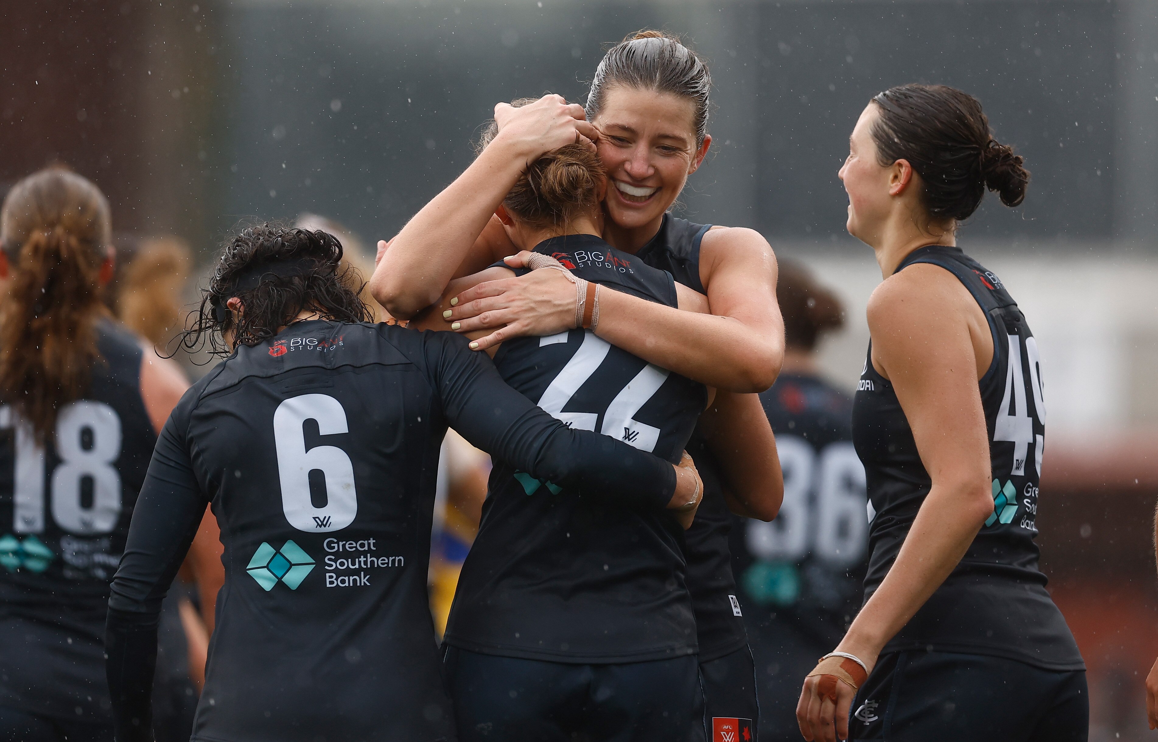 Sophie McKay (right) kicked two of Carlton’s six third-quarter goals as the Blues earned a thumping AFLW elimination final win over West Coast in the rain. (Getty Images: AFL Photos/Michael Willson)