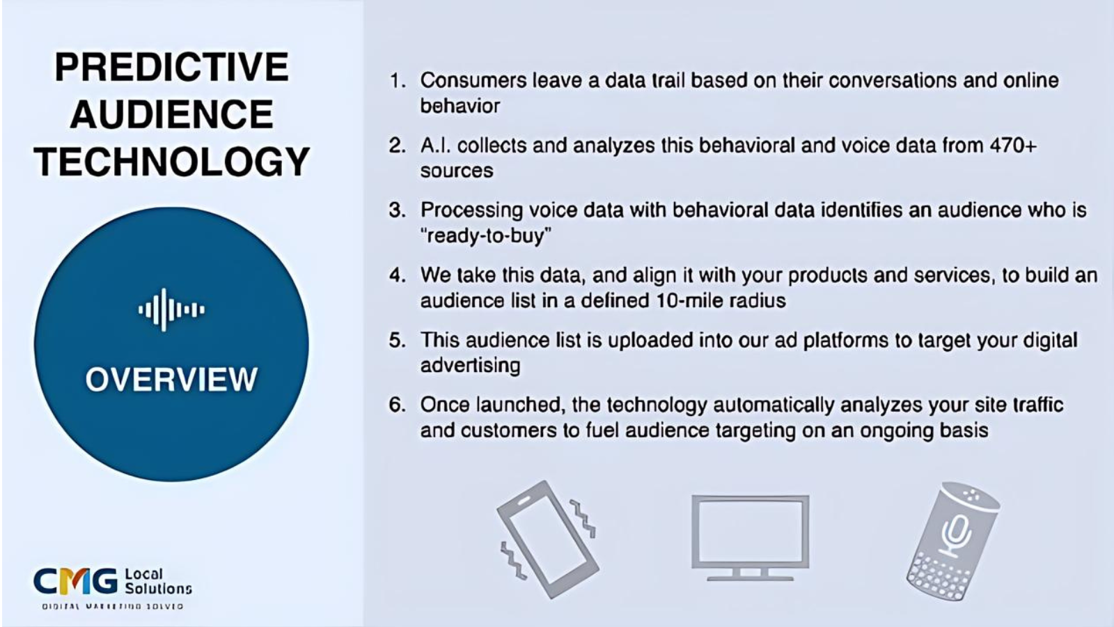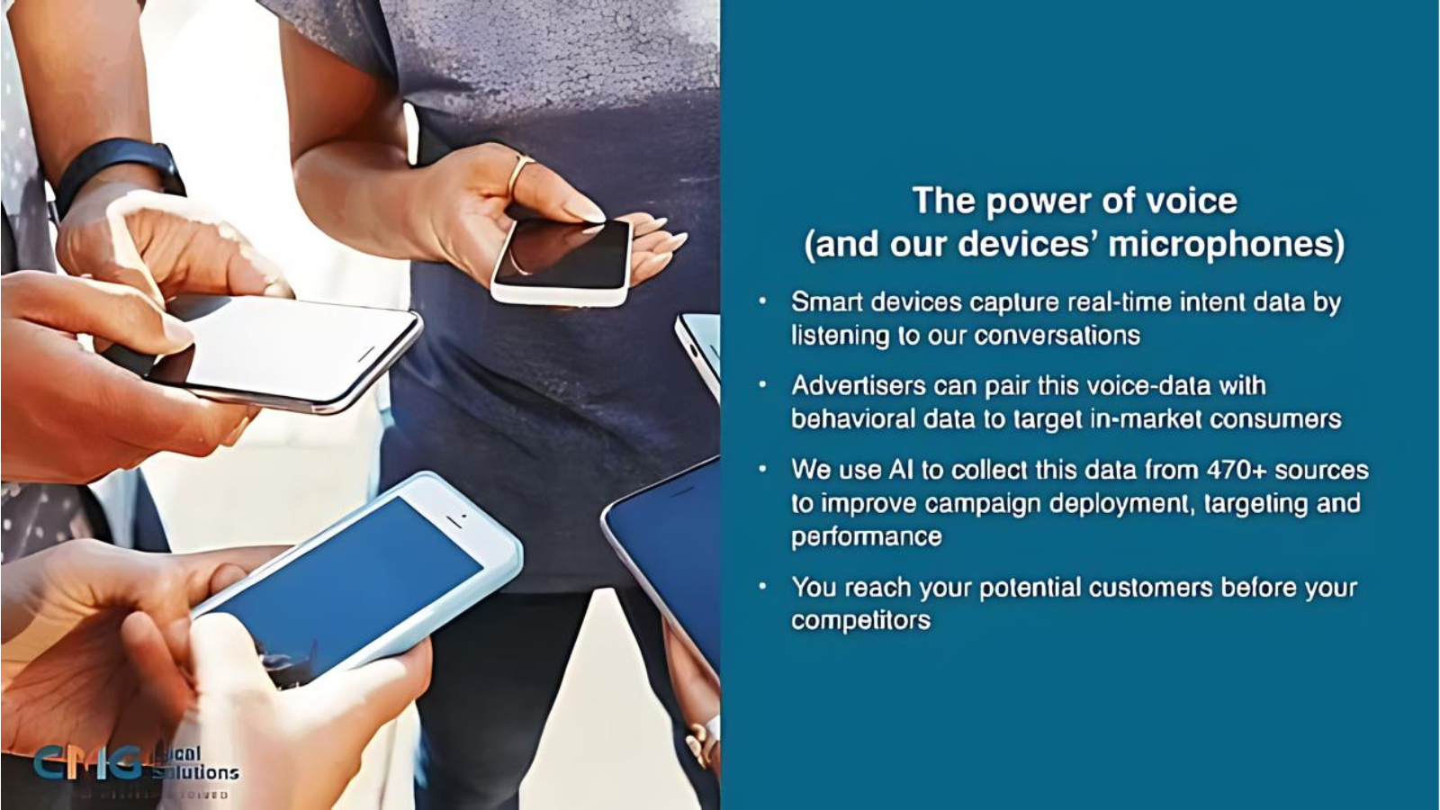 CMG’s pitch deck stated, “Advertisers can pair this voice data with behavioral data to target in-market consumers.” Consumers “leave a data trail based on their conversations and online behavior,” which machine learning AI collects and collates.