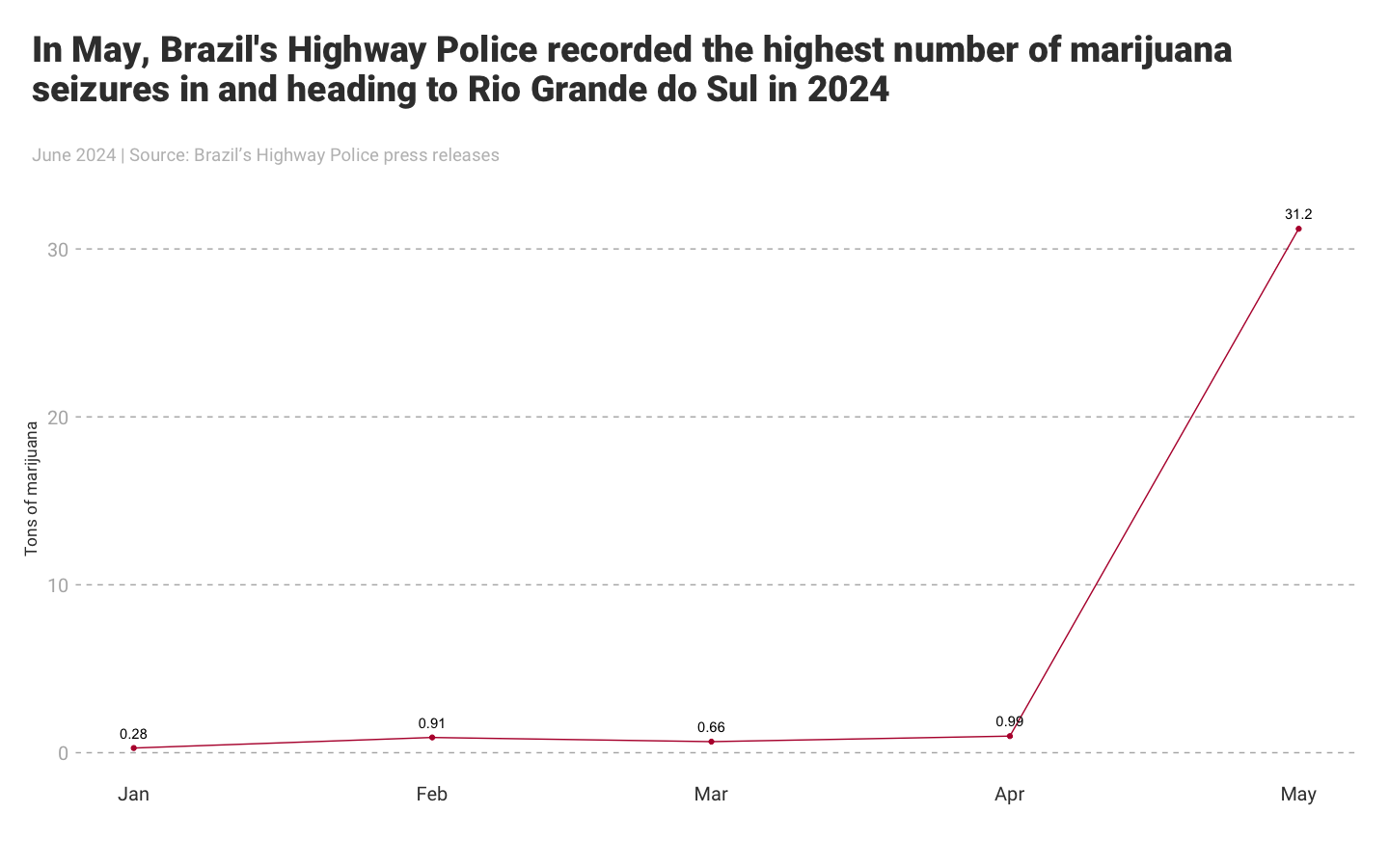 Major floods in the southern Brazilian state of Rio Grande do Sul led to record marijuana seizures there as criminal groups seeking to exploit the chaos and up their trafficking activities lost valuable product to an uptick in drug interdictions due to a heightened police and military presence.
