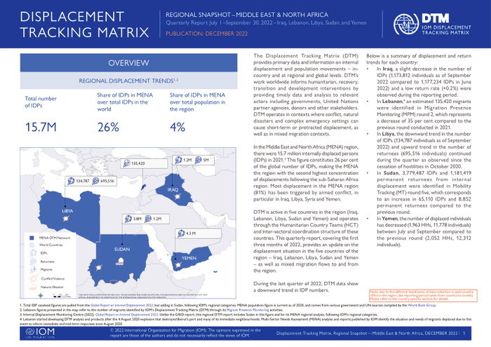 The Displacement Tracking Matrix (DTM) provides primary data and information on internal displacement and population movements – incountry and at regional and global levels. DTM’s work worldwide informs humanitarian, recovery, transition and development interventions by providing timely data and analysis to relevant actors including governments, United Nations partner agencies, donors and other stakeholders. DTM operates in contexts where conflict, natural disasters and complex emergency settings can cause short-term or protracted displacement, as well as in mixed migration contexts. In the Middle East and North Africa (MENA) region, there were 15.7 million internally displaced persons (IDPs) in 2021. This figure constitutes 26 per cent of the global population of IDPs, making MENA the region with the second highest concentration of IDPs worldwide (following the sub-Saharan Africa region). Most displacement in the MENA region (81%) has been triggered by armed conflict, in particular in Iraq, Libya, Syria and Yemen.
