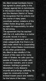 “My client is also aware of the impact this case will have on his home state of Sinaloa. He calls on the people of Sinaloa to remain calm, exercise restraint, and avoid violence ,” read his lawyer Frank Pérez.