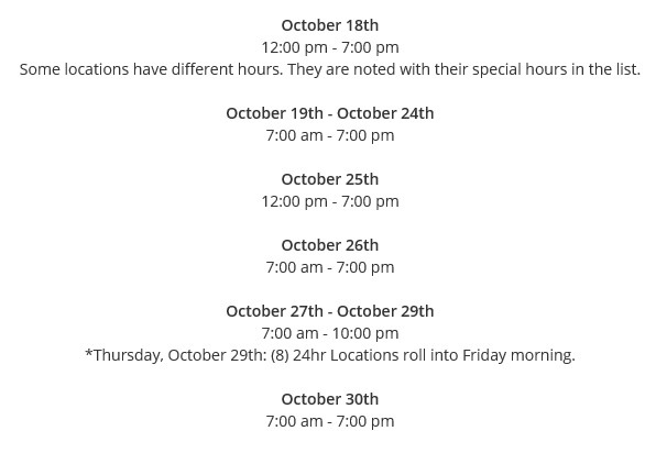 At Harrisvotes.com, clicking on “Polling Locations” and then the clock icon for “Hours of Operation” show that beginning on Thursday October 29 there were EIGHT polling locations that had 24-hour voting rolling into Friday morning.