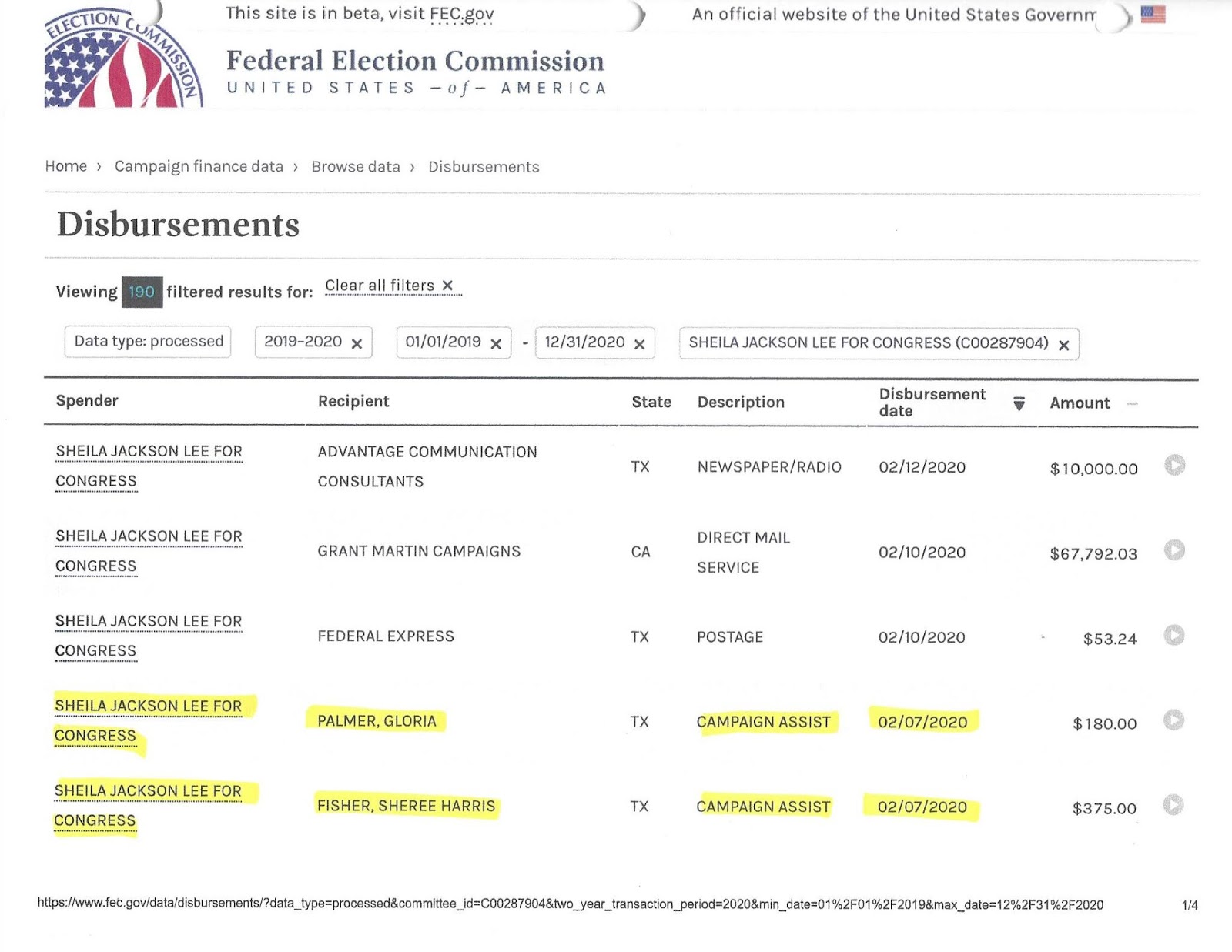 Sheila Jackson Lee’s campaign paid convicted forger Gloria Palmer as a “campaign assistant” multiple times in 2020, according to Sheila Jackson Lee’s campaign financial disclosures. Investigator Charles Marler confirms that the Gloria Palmer, who was paid by Jackson Lee’s campaign, is the same Gloria Palmer who mailed in the absentee ballot applications in 2020. A record shows Sheila Jackson Lee For Congress PAC paying Gloria Palmer for canvassing and campaign work in 2018. Here is a record of Sheila Jackson Lee’s campaign paying Gloria Palmer to be a “campaign assistant” in 2020.