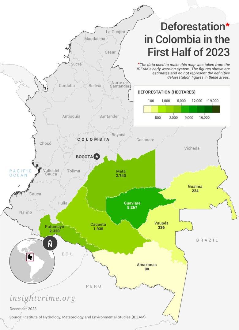 Protecting the Amazon is a pillar of President Gustavo Petro’s agenda. Since he took office in August 2022, he has managed to reverse the trend of rising deforestation seen in the first few months of that year. By the end of 2022, according to data from the Institute of Hydrology, Meteorology, and Environmental Studies (Instituto de Hidrología, Meteorología y Estudios Ambientales – Ideam), 123,517 hectares were lost, 29% less than the 174,103 in 2021.