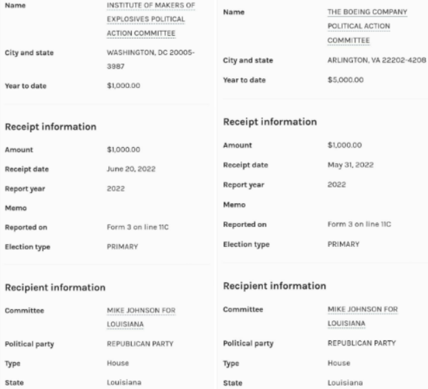 According to campaign finance reports, screenshots of which are viewable below, Johnson has received donations from, among others, major out-of-state war machine contractors like L3Harris, Lockheed Martin, Raytheon, Northrop Grumman, Boeing, and the Institute of Makers of Explosives.