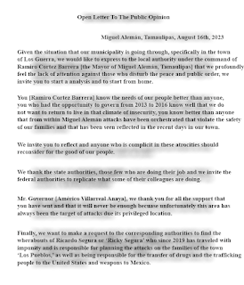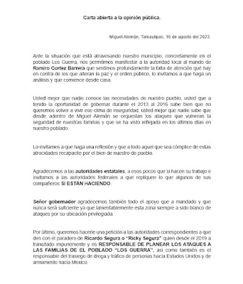 Segura would be named in an open letter that was published to social media on August 16th, 2023 where residents of the Los Guerra town of Miguel Alemán, Tamaulipas would urge for the deployment of federal authorities amid the severe insecurity that would derive from the attempts at territorial control by the Northeast Cartel and the Gulf Cartel who deem the town to be a strategic point to conduct illicit activities, while advocating for security forces to locate the whereabouts of Segura for his alleged involvement in a series of crimes such as orchestrating attacks against residents of the town Los Pueblos.