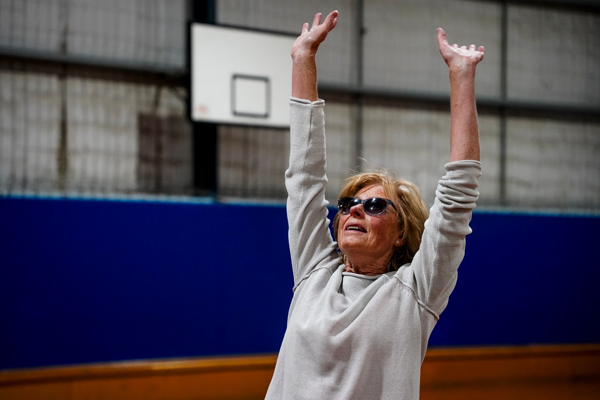 At the start of sessions, participants walk forward from the baseline to the middle of the court, following Thomas’ voice and counting how many steps it takes to get there.