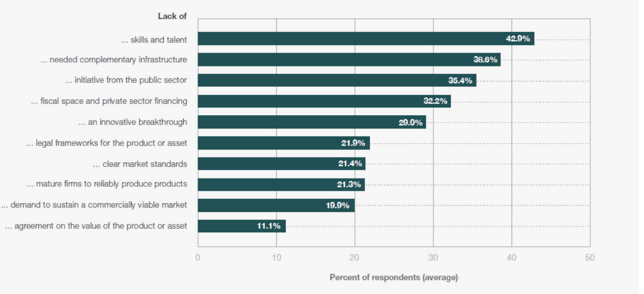 Much progress has been achieved on several fronts in the region when it comes to technology adoption and sectoral development. New market growth opportunities, however, will not be realised without a mature ecosystem. Out of ten bottlenecks identified by WEF’s research, see Figure 3, skills and talent, clear market standards and the lack of public sector initiative are likely to have the greatest impact on the region’s future growth trajectory.