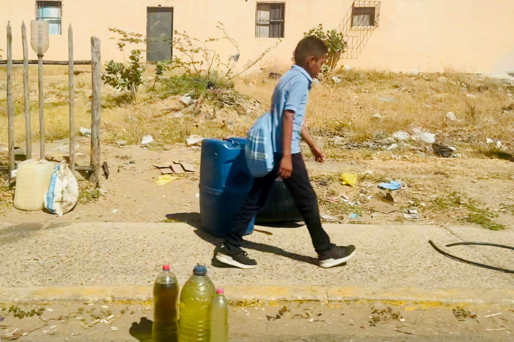 A boy walks past unguarded bottles of contraband gasoline in rural Zulia in January 2023