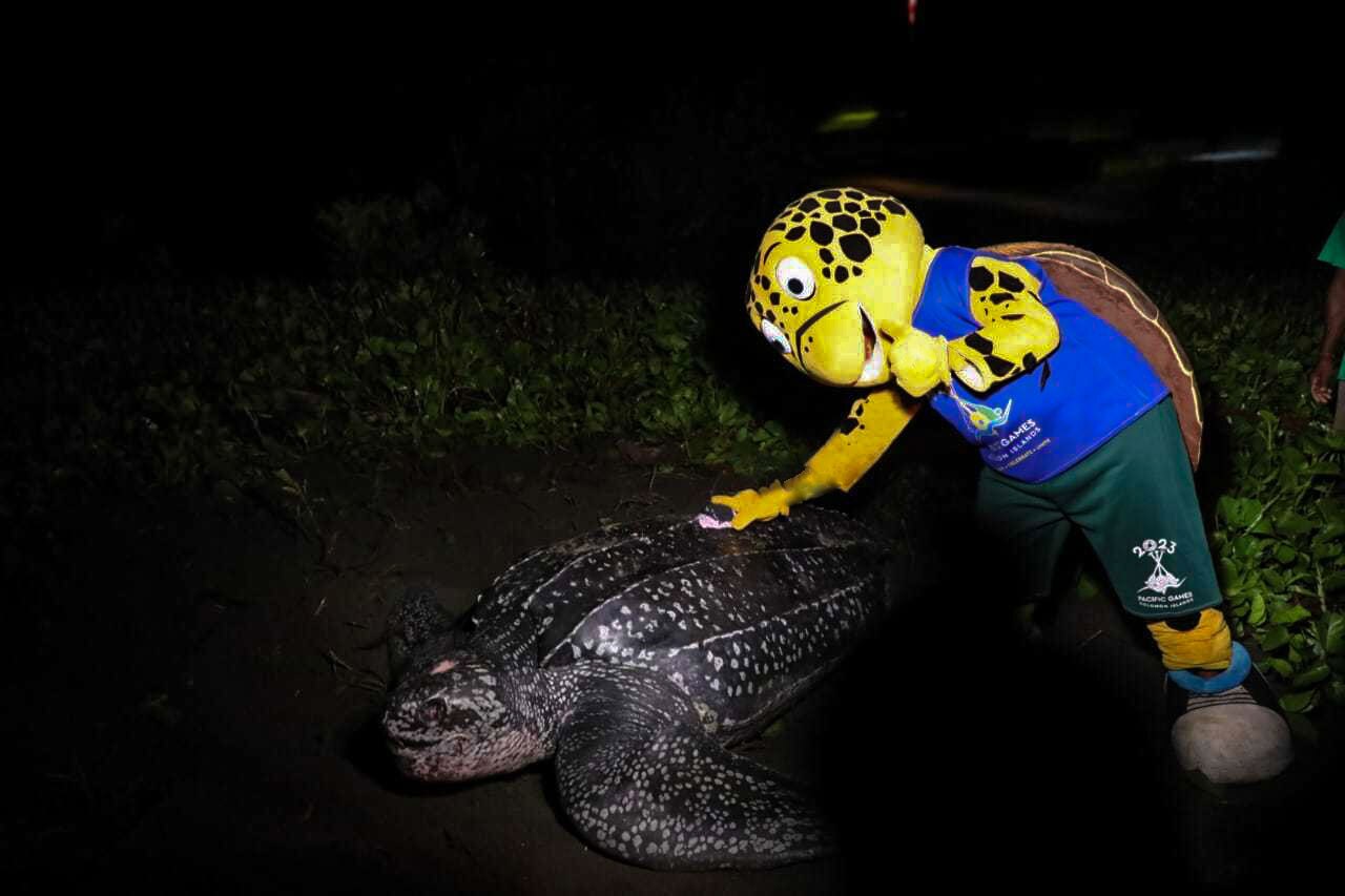 After the 167cm leatherback turtle laid her precious eggs on a select few beaches in Solomon Islands, the mascot swam 1,000 kilometres, arriving in Vanuatu last week.