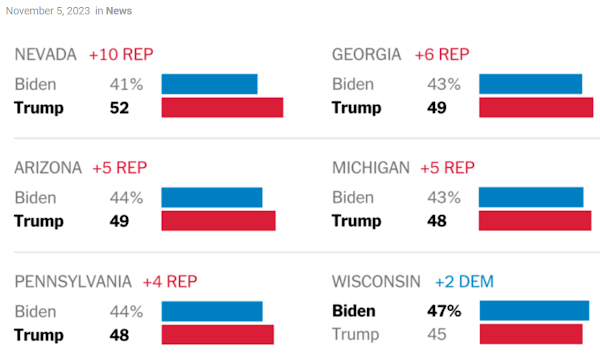 The results show Mr. Biden losing to Mr. Trump, his likeliest Republican rival, by margins of three to 10 percentage points among registered voters in Arizona, Georgia, Michigan, Nevada and Pennsylvania. Mr. Biden is ahead only in Wisconsin, by two percentage points, the poll found.