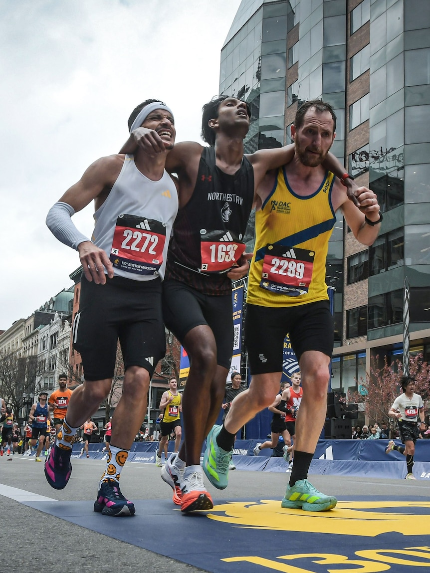 One of two men who helped carry a fellow runner across the finish line of the Boston Marathon said he had been struggling too, but drew strength from the supportive crowd.