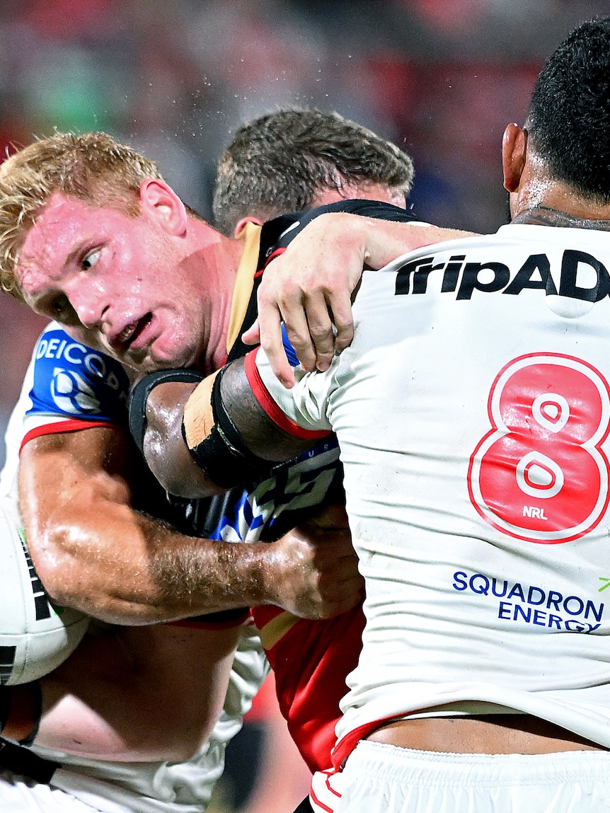 Dragons fullback Tyrell Sloan was a threat, and at one stage burst through before putting in a chip and chase. Tabuai-Fidow arrived in time to defuse the situation, showing pure determination.