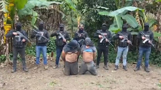 A 7 man team of armed assassins appears on film during daylight hours in a heavily wooded area. 2 male captives are kneeling on the ground front and center. The prisoners shirts have been used to obstruct their field of vision.