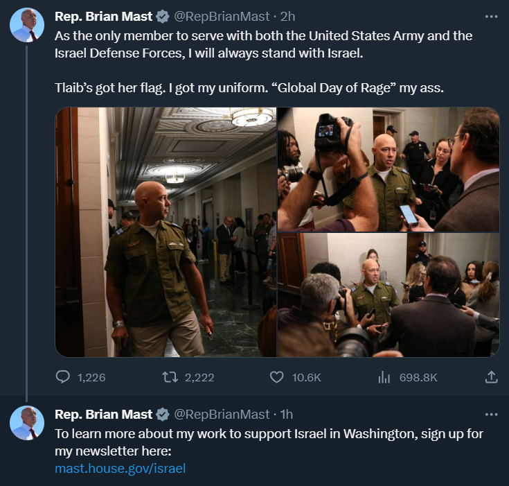 Mast, who markets himself as a major Israel supporter, told members of the media that he wore the Israeli uniform to Congress as a counter to the Palestinian flag that flies outside of Democrat Rep. Rashida Tlaib’s office, and said much of the same in a post that he made to X, including several photographs of himself in the U.S. Capitol, in his Israeli uniform.
