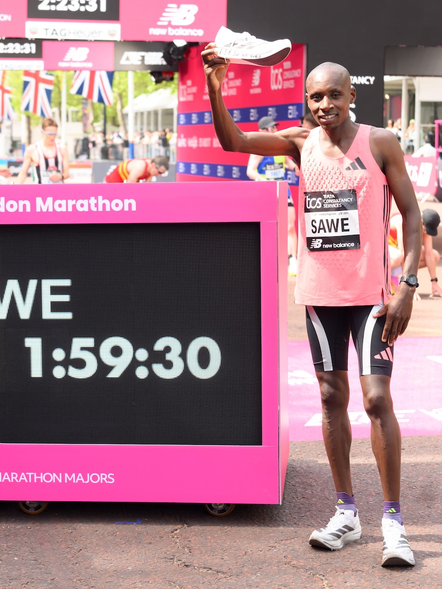Sabastian Sawe with the now-traditional Monty Python-esque holding up of the shoe. (Getty Images: Karwai Tang)