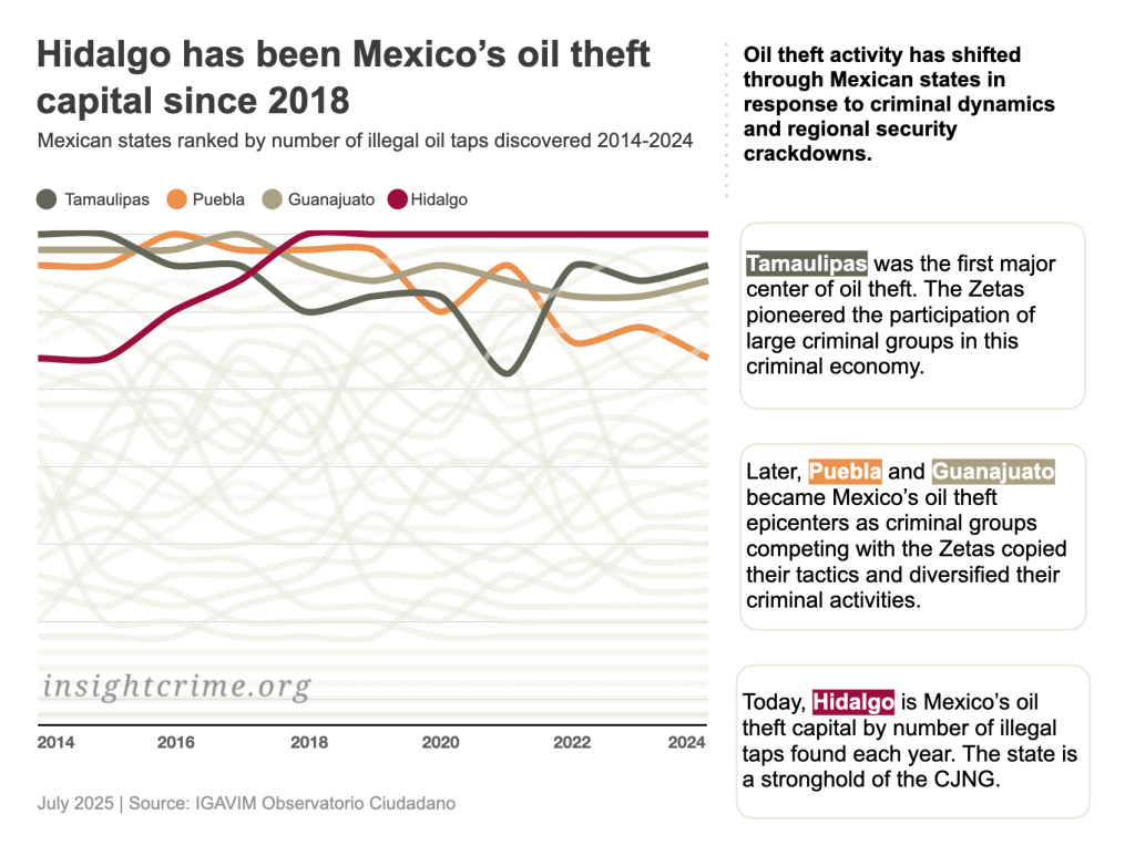 “You have to control where the pipelines are in order to do the thieving … So [criminal groups] fight over physical territory in a way that they don’t fight over territory to traffic synthetic drugs like fentanyl or methamphetamine,” Jane Esberg, a researcher who studied fuel theft in Mexico, told InSight Crime.
