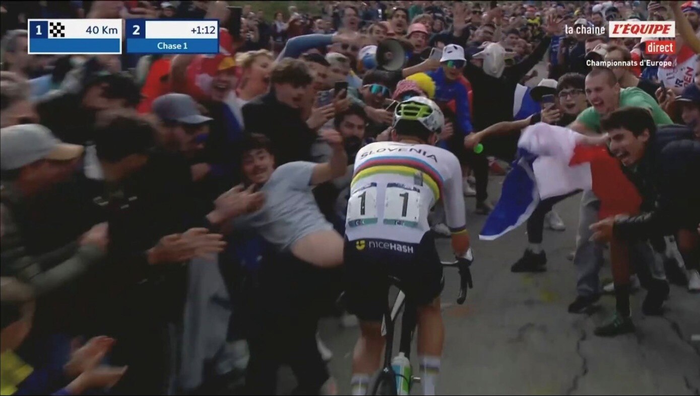 Soon after that moment of exhibitionism, another set of fans appeared to slap stickers onto the back of Pogačar as he rode past on the ascent of the Côte de Saint-Romain-de-Lerps.