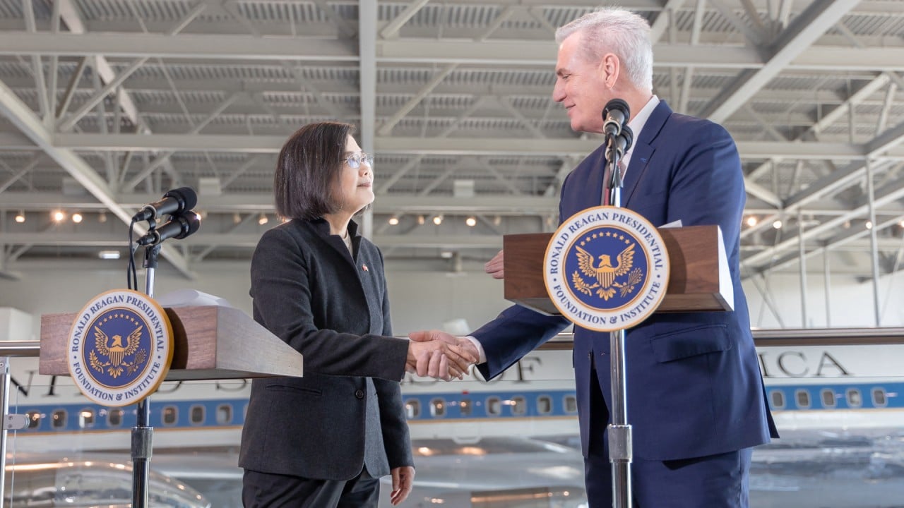 Taiwan’s president, Tsai Ing-wen, and US Speaker of the House Kevin McCarthy attend a meeting at the Ronald Reagan Presidential Library, in Simi Valley, California, US, in this handout picture released on April 6. Photo: Taiwan Presidential Office / Handout via Reuters