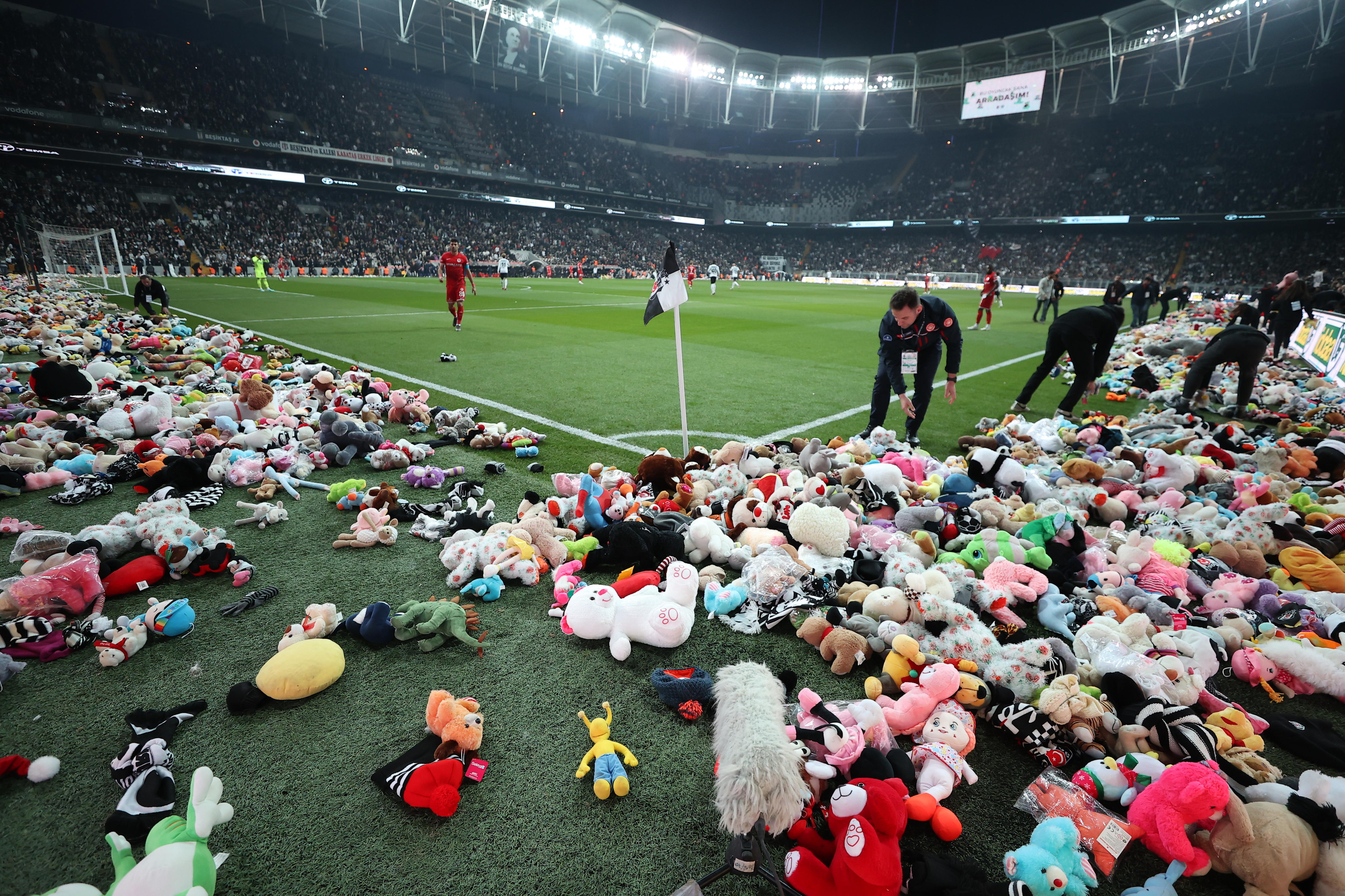 Fans of Turkish football club Beşiktaş have shown their support for children affected by the Türkiye and Syria earthquakes, showering the team’s Istanbul pitch with thousands of stuffed toys.