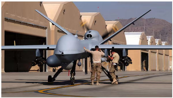 U.S. airmen stand by a U.S. Air Force drone in March 2016. Unmanned vehicles are considered key to deterring a Chinese attack on Taiwan. © Reuters