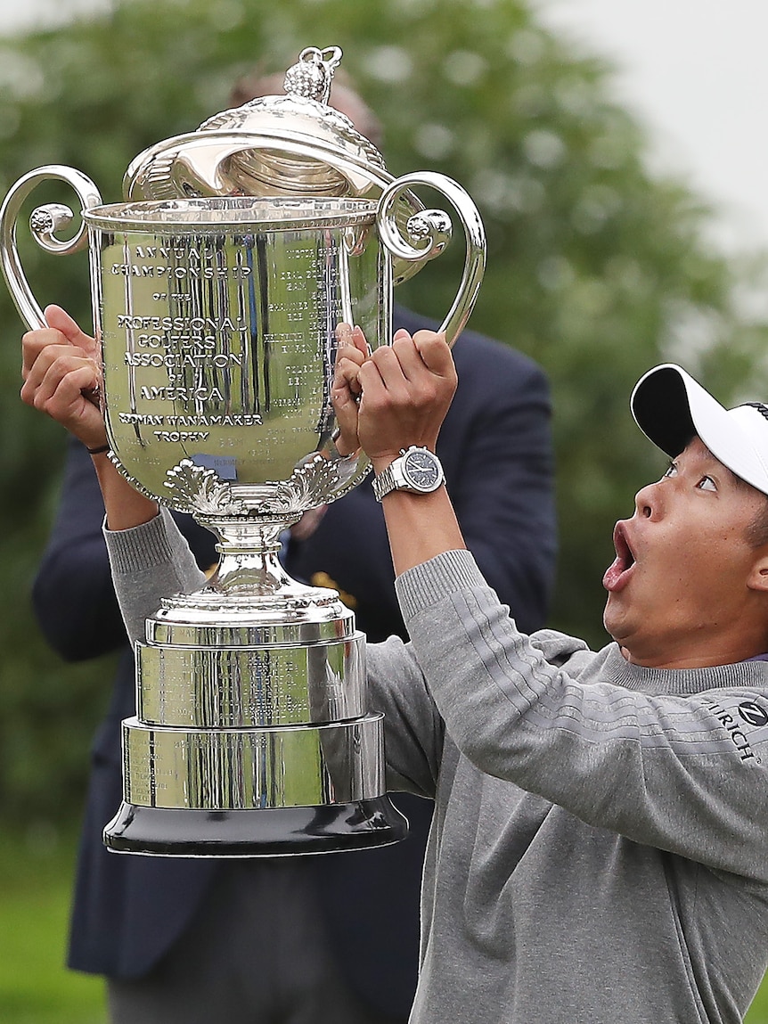The Wanamaker Trophy, which includes the engraved names of every PGA Championship winner, measures 75 centimetres high, 68.5 centimetres from handle to handle and weighs 12.2 kilograms, making for a somewhat awkward hoist — particularly after playing 18 holes.