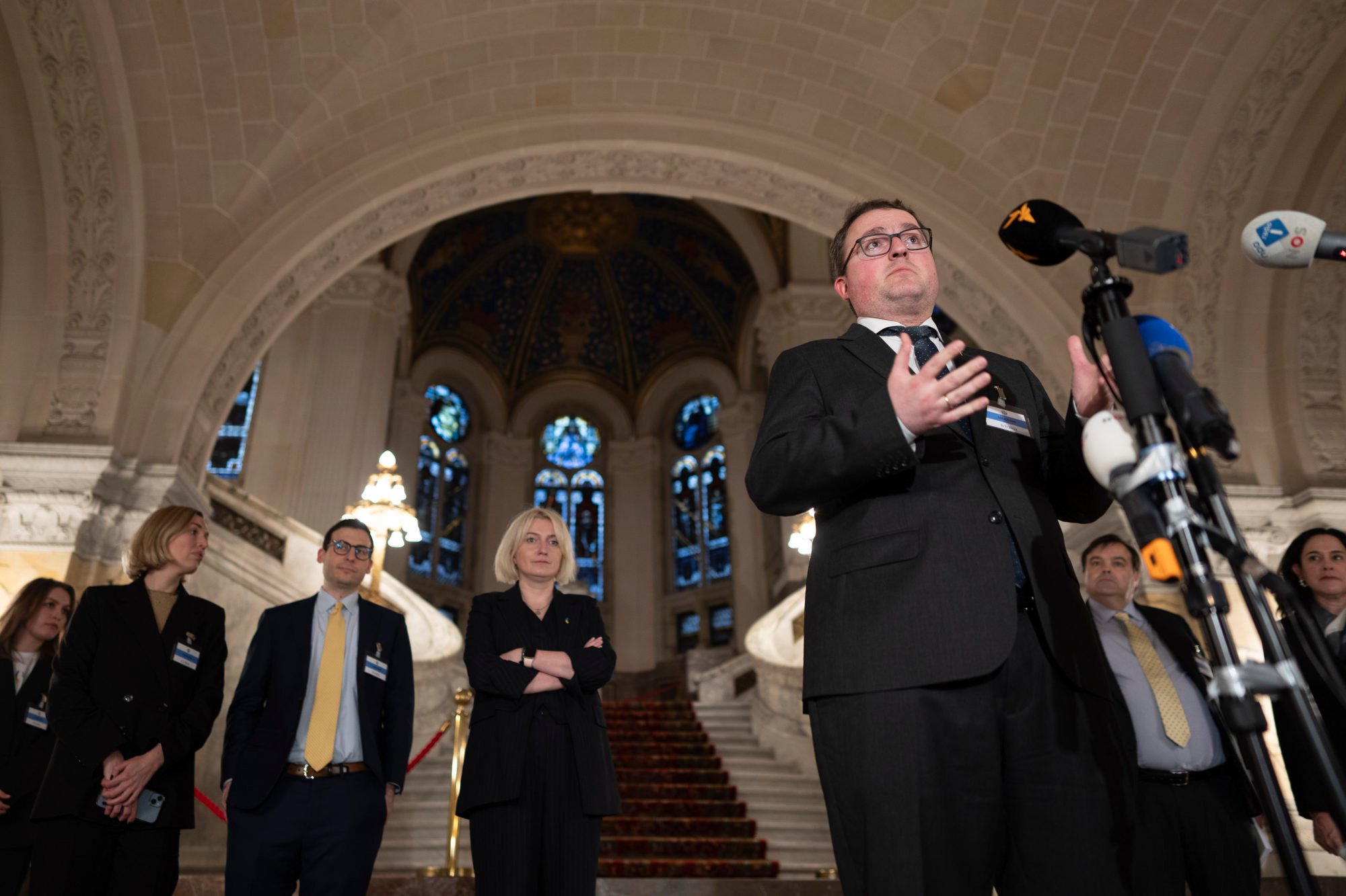Anton Korynevych, ambassador-at-large of the Ukraine Foreign Ministry, gives a statement after the International Court of Justice ruling on Friday. Photo: AP