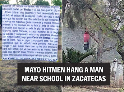 Sinaloa Cartel – Mayo associated hitmen tortured a man and left his body hanging from a tree alongside a narco-message near a high school in Ojocaliente, Zacatecas.