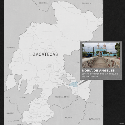 The local news company NTR Zacatecas adds that at 4:00 pm, hitmen were seen stealing cars in Noria de Ángeles, shown on map below.